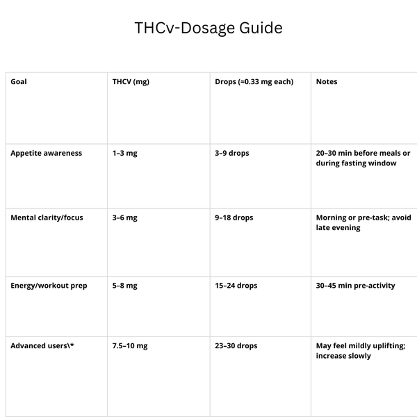 Our guide provides comprehensive dosing protocols: Start with 2.5-5mg THCV for beginners, 5-10mg for intermediate users, and 10-20mg for experienced users. The guide includes detailed mg-to-drop conversion formulas, dosing charts based on tincture concentration, body weight considerations, and timing strategies for optimal focus and energy effects throughout the day.